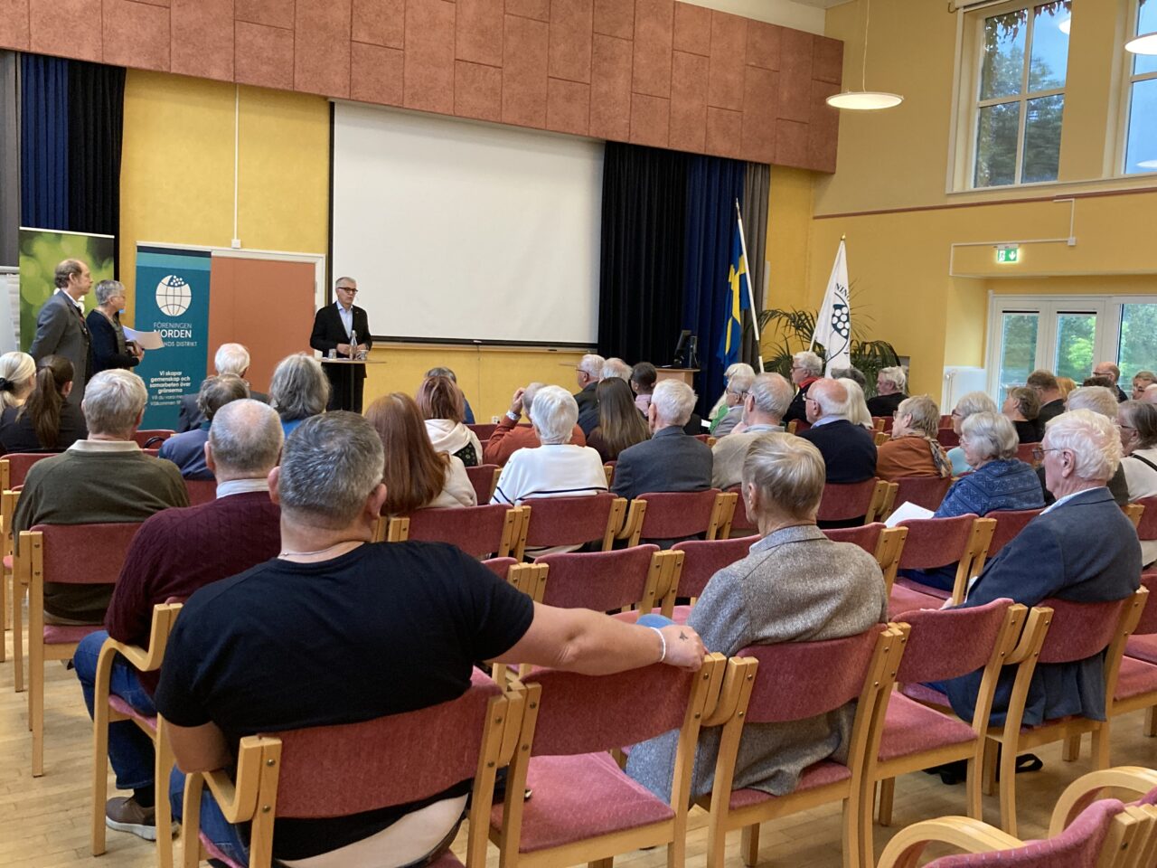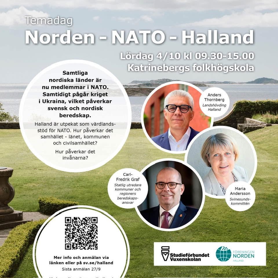 Landshövding Anders Thornberg inledde temadagen som arrangerades av Föreningen Nordens Hallandsdistrikt med att kommentera omvärldsläget. Det är mycket instabilt med kriget i Ukraina som bara fortsätter, problemen i mellanöstern med krig mellan Israel och terrororganisationen Hamas i Gasa. Vidare angrips våra grannländer av provokationer av olika slag från tre stora hot: Kina, Ryssland och Iran. Utöver det har vi klimatförändringarna, terrorism och gängkriminalitet.