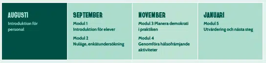 Upplägget uppbyggt i moduler och möjligheten att välja mellan två alternativ gör det lätt för dig som är lärare eller mentor att plocka delar av materialet som bäst passar behovet i din klass. Det går exempelvis utmärkt att testa metoden med din klass under en termin (se processchema för alternativ 2 nedan) för att fokusera på ett särskilt hälsofrämjande område. Det går också att genomföra några moduler under exempelvis en temadag. Upplägget kan även varieras för olika klasser på samma skola, några kan följa alternativ 1 och andra alternativ 2.